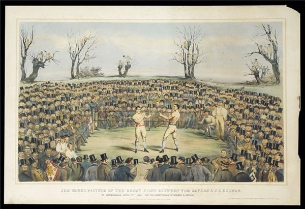 Famed assemblage for the “International Contest Between Heenan & Sayers at Farnborough, on the 17th of April 1860.” Printed 1860 by George Newbold. 43x32”. Copy of the original key on the back identities the detailed faces of the assembled patrons including many legendry pugilists: Nat Langham, Editor of Bell’s Life, Ned Donnelly, John Morrisey, Jem Mace, James Ward and many more. Slightly wrinkled, with spotted staining, but visually very pleasing. VG-EX.