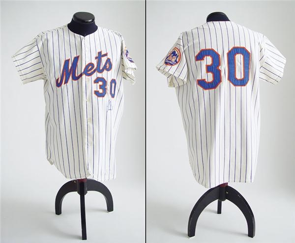 New York Mets jersey was made for Nolan Ryan for the 1972 season. This extremely rare 1972 Mets game-issued jersey features Ryan’s number “30” on the front and reverse, with “44 72 30” embroidered on plate in the collar. Ryan did not play for the Mets in 1972, making this Rawlings jersey a non-game worn example, but the Mets expected him to play that year and had jerseys made before he was traded to California on December 10, 1971. Ryan has signed in blue felt tip on the front. Tagging inside front left tail is “Rawlings [size] 44”. LOA.