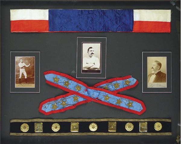 Offered is one of the most important pieces of boxing history ever to come to the auction block. True museum quality pieces originating from the great John L. Sullivan, which have resided at the estate of late family member, General William Sullivan & Mrs. Blanche Sullivan until recently. The mounted display encased in glass and frame is highlighted by a ring belt made for the original great American sports idol known as the Boston Strong Boy. The black velvet belt is 32” in length and adorned with 9 brass ornaments - 4 square & 5 circular. The trim is done in woven metallic thread. At top is a red white & blue satin sash, which Sullivan wore around his waist while entering the ring. Placed at the center of the display are three cabinet photos, 5x7” in size - two of which are facsimile signed by Sullivan. Below the photos is a tattered and worn turquoise & red crossed ribbon adorned with 12 gold stars. This display was originally obtained by the General, William Sullivan at a Sullivan family reunion. Being a distant relative of the great prizefighter, William Sullivan returned home with this amazing piece in his possession. It is now being presented as a golden, once-in-a-lifetime opportunity for a deserving member of the general public, having been recently obtained from the gentleman who probated the estate, while also helping the General and Mrs. Sullivan with legal matters. This gentleman also served in WWII, and practiced law after returning home from serving as a Special Agent in the FBI. He came to own this item, among others from the deceased General’s wife as gifts for his antique shop, which was opened following his retirement from practicing law. LOA. Framed display measures 39x30”.