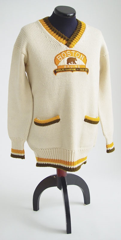 Standing over six-feet tall and tipping the scales at 200-pounds Dit was a physical specimen to say the least. Now match that with his extraordinary skill and determination and it is no wonder he became a legend in the sport. In only his sophomore season the young Clapper was united with Cooney Weiland and Dutch Gainor, later known as the “Dynamite Line”, and together they would deliver to Boston its first Stanley Cup. Following that victory he was presented with this handsome beige wool cardigan. Accented in brown and orange, the sweater owns an embroidered felt patch that reads, “Boston Bruins, World Champions-1928-29” on the chest. Manufactured by the “Horace Partridge Co.” it has remained in NRMT-Mint condition after more than seven decades. A remarkable item and unique part of hockey history from this immortal Hall of Famer.