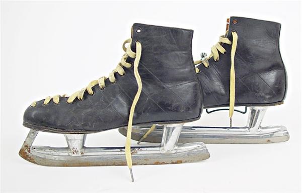 Vintage leather CCM Tackaberry boots & blades were worn by Hall of Fame defenseman Aubrey “Dit Clapper” en route to the Boston Bruins’ third Stanley Cup Championship in 1941.  These historic skates have “Reg. 1934” stamped into the CCM Prolite blades, size 9.5.  Great use and well worn with a stitched repair patch on one ankle.  From the personal collection of the late Aubrey “Dit” Clapper.  Includes LOA from family.