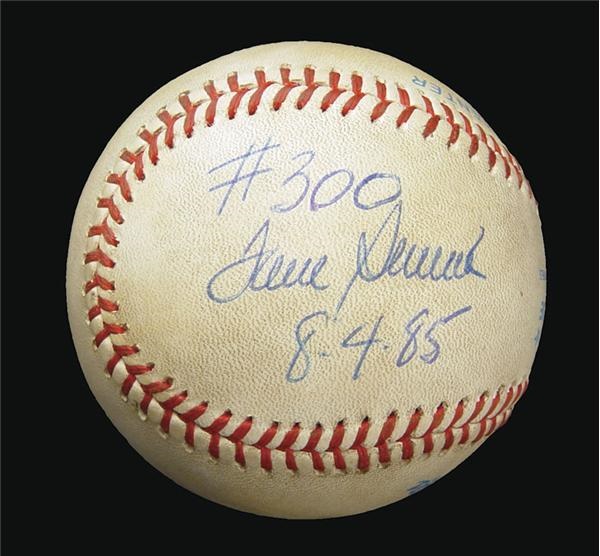 OAL (Brown) baseball was used in Tom Terrific’s milestone 300th win game in Yankee Stadium on August 4, 1985. Shows excellent use with evenly “rubbed in” stadium dirt. Signed in blue ballpoint by the most Amazin’ Met of all time on the panel: “#300 Tom Seaver, 8-4-85.” Signature grades a “9” out of a possible 10.