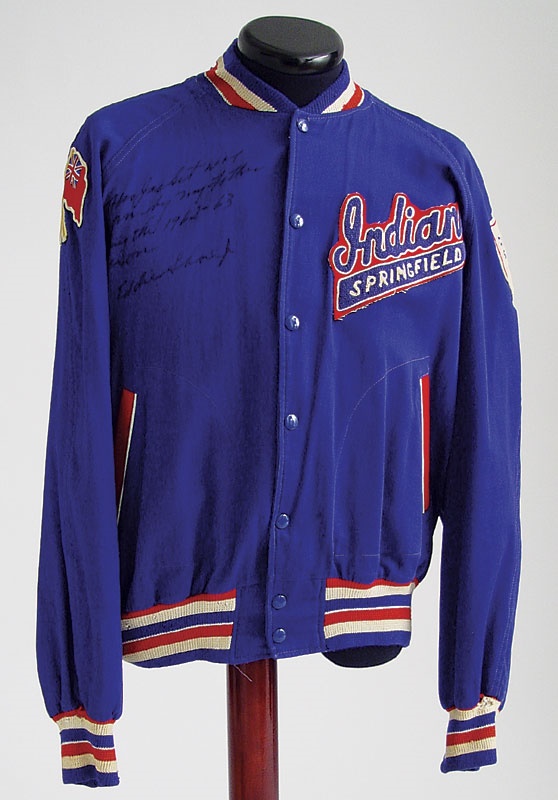 AHL Springfield Indians jacket was worn by Mr. Hockey, Eddie Shore during the 1962-63 season. Shore bought the Springfield Indians in 1939 while still an active Boston Bruins legend, hoping to play on both teams. This would never come to be as he was released a short time later by a displeased Boston front office. The Edmonton Express proceeded to coach and play for the Indians, leading them to dominance in the legendary Easter States Coliseum. Blue button-down jacket adorned with “Springfield Indians” in blue scripted embroidery on red felt patch on the left breast. Right sleeve bears the embroidered crossed American & Canadian “Union Jack” flags emblem. Left sleeve with “AHL Champs 59-60, 60-61, 61-62” patch. Best is the inscription penned by Eddie Shore, Jr. on the front in black felt tip: “This jacket was worn by my father during the 1962-63 season - Eddie Shore, Jr.” Tagged inside front tail, “Empire Sporting Goods, NY”. Shows good use and wear. It is medium size.