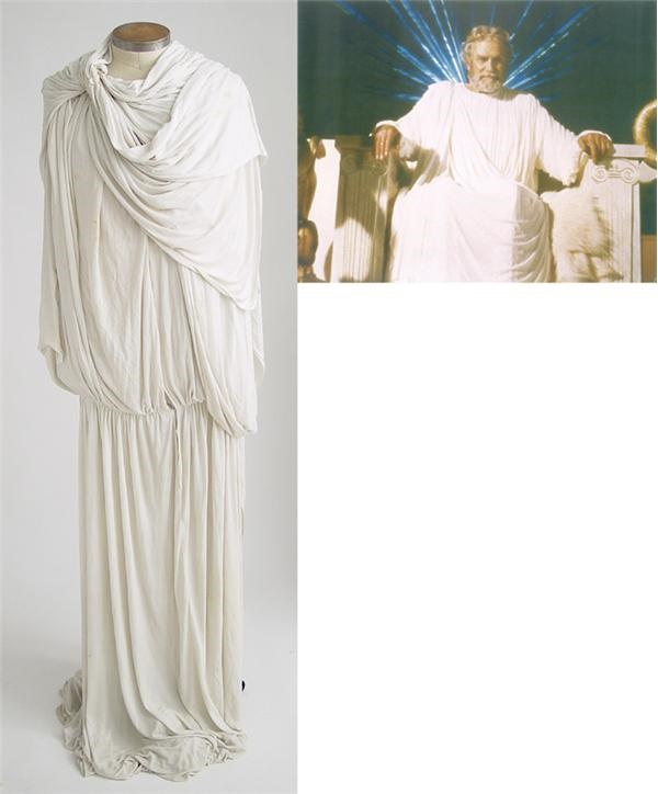 A full length, white crepe Grecian robe worn by screen “God” Laurence Olivier in his unforgettable performance as Zeus in the classic “Clash of the Titans.” Originally obtained from costumers “Angels & Berman”. Significant soiling and staining throughout. Accompanied by a still. Ex-Planet Hollywood Collection.