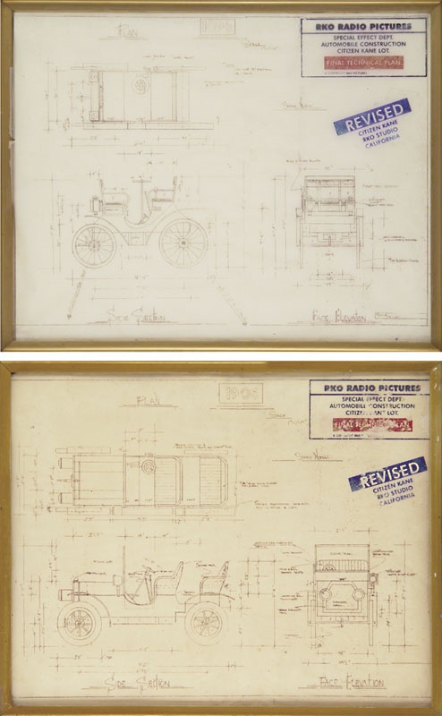 Two original automobile blueprints from the legendary Orson Welles epic "Citizen Kane", each stamped "RKO Radio Pictures Special Effect Dept. Automobile Construction Citizen Kane Lot Final Technical Plan." Both are in their vintage frames, and one includes a letter on the reverse from Harvey Henry, who's aunt was part of the film's production staff. Both frames exhibit wear, the blueprints are in overall Excellent condition. 25 x 20 1/2 inches. Ex-Planet Hollywood Collection.