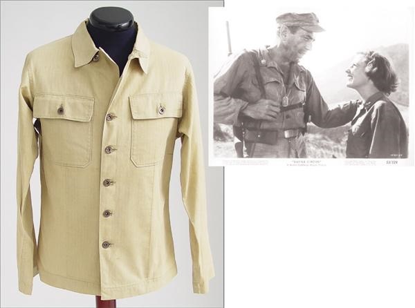 A beige cotton military-style shirt worn by Hollywood legend “Bogie” in the 1952 film “Battle Circus.” It features a handwritten MGM label in its collar inscribed, “S-169 H. Bogart 1595.” Accompanied by two stills. Ex-Planet Hollywood Collection.