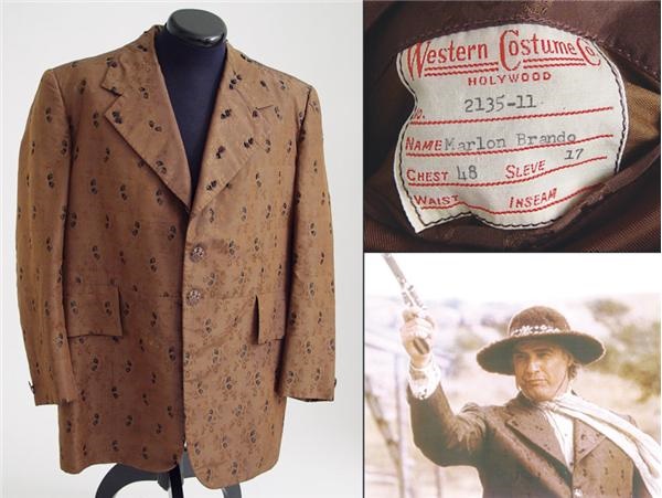 A brown silk jacket with embroidered flowers and black and red beads, worn by legendary actor Marlon Brando in the 1976 “The Missouri Breaks.” It features a typewritten Western Costume label inscribed, “2135-11 Marlon Brando Chest 48 Sleeve 17.” Accompanied by a still. Ex-Planet Hollywood Collection.