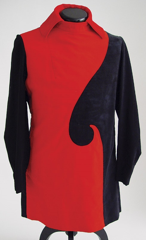 A velour tunic with a red and black swirl on the front and back worn by Jonathon Harris as “Dr. Zachery Smith” in the televison show “Lost in Space.” The garment was originally worn by an alien in Season 1, then tailored to fit Jonathon Harris for the second season and beyond. It features a stamped "Western Costume Co." label on the inside. Ex-Planet Hollywood Collection.