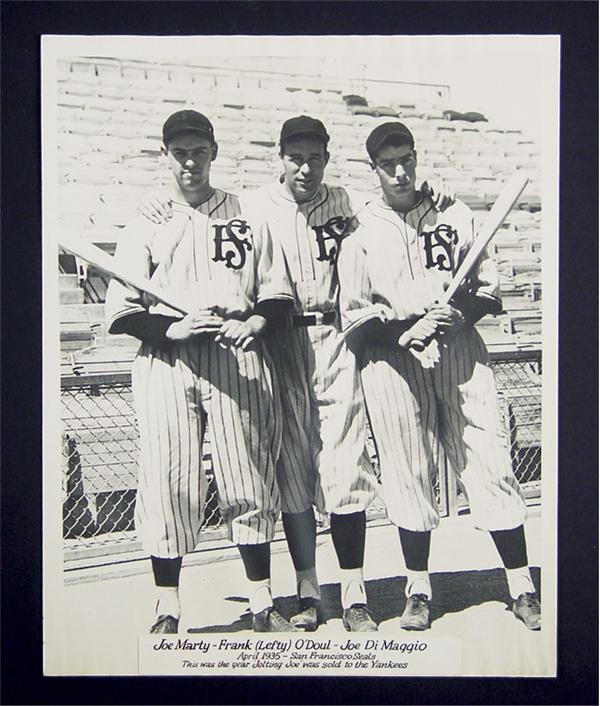 A spectacular photo of the young Joe DiMaggio taken during the final season with his hometown San Francisco Seals only months before the legend of Joltin’ Joe, American icon, began. The eighteen year old slugger bookends player/manager Frank O’Doul along with teammate Joe Marty in this wonderful image that once hung proudly in Lefty’s restaurant. It exhibits light wrinkling along the top border and a single crease to the top left corner but is in otherwise EX condition. One of the finest early DiMaggio photos around.