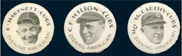 Rarely do you have the opportunity to buy the best of a scarce set. Tough to find 1.25” celluloid pins advertise the Evening American Chicago newspaper. Each features the head of a Cubs Hall of Famer: Hack Wilson, Gabby Hartnett, and manager Joe McCarthy. Overall EX-MT.