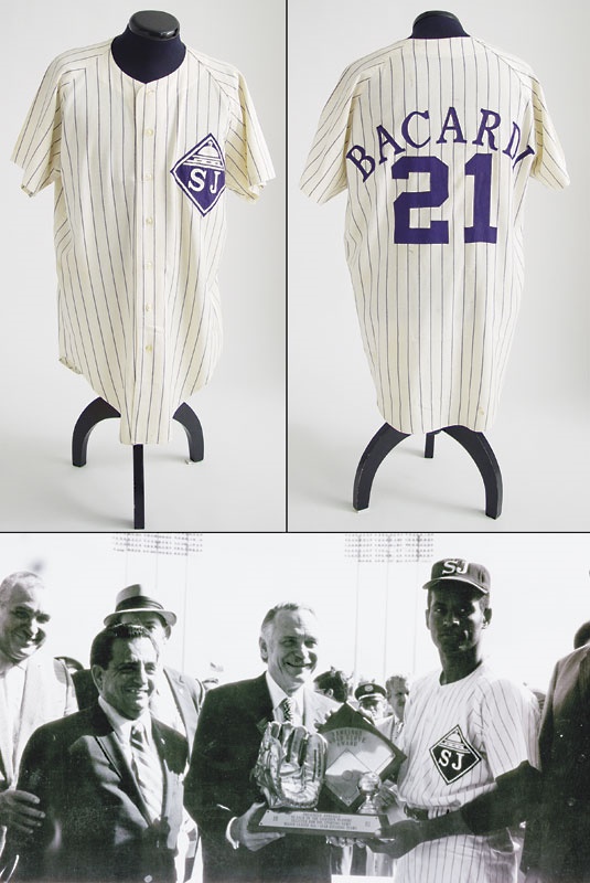 In the history of Roberto Clemente collecting, there has been none more distinguished than this San Juan Senadores jersey, worn by the Great One during the 1971 Winter League in San Juan. Straight from his native Puerto Rico, this white pinstripe jersey, bearing the blue diamond team patch with “SJ” embroidered in white over the heart is the most extraordinary piece of the legacy ever to surface. Bearing his legendary “21” on the verso in navy tackle twill, along with the arched name of their sponsor, “Bacardi” above, it is presented as a predominant piece of baseball lore. Best of all, it displays the unmistakable evidence of use during competition in the form of staining and wear attributed to game use. One can only imagine the feats accomplished while he was wearing this jersey in his native land, just one year before his untimely death. To further strengthen its authenticity, it comes with a photo of Clemente accepting his Gold Glove award (from 1961) from Governor Louis Ferrie, while wearing this very jersey! As you will see, the pinstripes, which are like the jersey's fingerprints, match up exactly with the jersey in the photo. Photo is also signed by Ferrie. Collar tagging is a faded “Wilson [size] 42”.