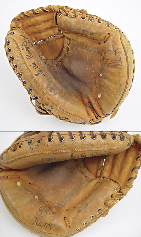 A most historic piece of game used baseball equipment from the Puerto Rican born, Ellie Rodriguez of the California Angels. Wilson 1691 Snap-Action was worn to catch Nolan Ryan’s 4th no-hitter. With that single performance on June 1, 1975, the Ryan Express tied the record set previously by Sandy Koufax. Ryan would, of course, finish his career with a total of 7 no-nos. Aside from displaying the world class use attributed to such a game, the glove is inscribed completely in the hand of Rodriguez, 4th no hitter of Nolan Ryan” along the outer ridge of the thumb. Additionally, it is signed (also on thumb) by Ellie Rodriguez and dated. Most memorable are the two signatures from Ryan on the inside of the pinky. Both are dated with the day of his 4th no-hitter, and signed (one in green marker - faded, the other in black). Back of glove is marked in 2 spots with Rodriguez’ number, “6” in vintage black marker, along with his first name, “Ellie.”