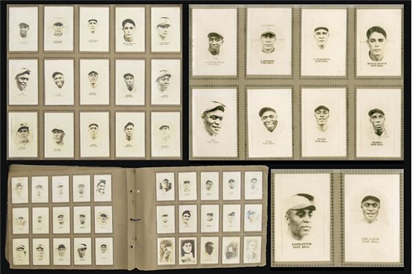 One of the best card albums we have ever offered. Submitted for your perusal is this complete card album of 900 sports and non-sports cards. The 44 baseball are the key and feature many of the greats of the Negro Leagues: Torriente, Charleston, Mesa, Marsans, Rios, Mendez, Dreke (2), Rojo, Luque, Dressen, McKey, Moore, Duncan, Pedroso, Lundy, and Oms. The two Pop Lloyd cards are here including the “Sam Lloyd” and the rare misidentified “Joe” card. Cards are all glued into the original album and can be easily removed. The real photo cards themselves have corners as sharp as a blade. There is some surface dirt, which should be easy to clean. Just three cards are a bit faded with the Oms being the only one of importance. Many NRMT cards should be able to be extracted from this album after all is said and done. There are about 200 other sports here including 28 Boxing (Battling Siki, Owen Moran), Football (soccer), Jai alai, and more. Of the approximately 750 non-sports cards there are many silent film stars (Chaplin, Lloyd, Valentino, Rin Tin Tin, Keaton, and six Lon Chaney), romance, and glamour girls featuring the Follies-Bergere dancers. The album itself is tattered but has the original covers with the blue cloth worn off.