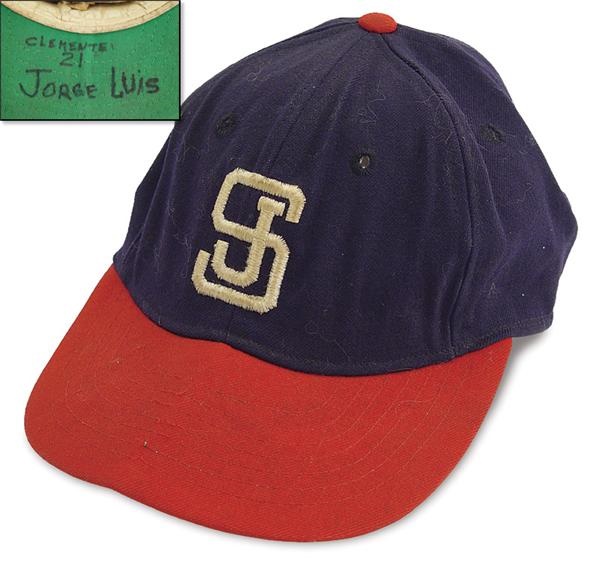 Anything tied to Puerto Rican Hall of Famer, Roberto Clemente is worthy of a thousand praises, but this cap, which has changed hands from Clemente, to Puerto Rican born Jorge Posada, from Posada’s father, is an unparalleled piece of his legacy, attached to the most impeccable provenance. The navy cap with red brim, with embroidered “SJ” in white thread on the front was worn for Puerto Rican Winter League games by Roberto Clemente in San Juan. This was once part of a complete uniform given to the father of current New York Yankees pitcher, Jorge Posada. Posada’s father gave the hat to his son while he was still a young lad, aspiring to play ball. The most amazing part to this phenomenal piece is what is written under the visor in black marker. The first inscription is a block letter signature from Clemente reading, “Clemente 21” (21 was of course his legendary number worn with the Pirates). Underneath that is “Jorge Luis”, penned by Jorge Posada as a young boy. There is unbelievable history and prominence in this fabulous piece from his native Puerto Rico. Shows great use and wear, through and through with plenty of wear to the inside leather band. Tagged, “The Leslie Company.”