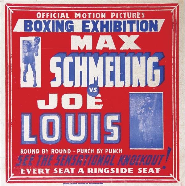 The will of two nations came face to face in the squared circle on June 19, 1936. Louis, the champion, a symbol of freedom and the American way versus Max Schmeling, the poster boy for Hitler’s Third Reich. This tri-color poster produced by “Official Motion Pictures” advertises the film release of that remarkable bout. Its top and left borders exhibit light creasing and there is discoloration and spotting throughout. VG-EX.