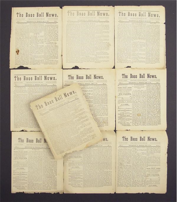 One of the first baseball newspapers ever produced, this predated The Sporting News and Baseball Magazine by decades. Fabulous baseball content from “The Battle of the Pennant” to “The First Professional Champions,” the 1869 Cincinnati Red Stockings. Published by Howard H. Goshen of Mifflintown, Pennsylvania, these issues of this weekly newspaper runs from May 3, 1877 to July 12, 1877. The last two issues are both #10 and may have been the last ever (trying to trick subscribers?). 8x10” and 4-pages each, overall Good. Only specimens known.