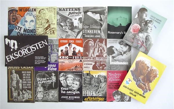 Huge collection of Danish movie programs represent the 1930's through the 70's. An extraordinary collection, including such films as Mutiny on the Bounty, Witness for the Prosecution, Rosemary’s Baby, & The Exorcist; Film Noir such as Scandal Sheet with Broderick Crawford, Mrs. Miniver, Papillion, Born Yesterday, The Search with Monty Clift; Ealing Studios English comedy’s including Ladykillers, The Apartment, Spellbound, Three Faces of Eve, Last Tango of Paris, Dawn Patrol, and many others. Condition varies from G to NRMT, overall is EX. Sizes vary from 4.5x6” to 6x8”.