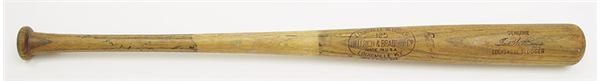 This hunk of hickory was wielded by the Splendid Splinter during the twilight of his storied career. The 1950’s proved that Ted Williams was not only one of the most talented players baseball had ever seen, but also that he was one of the most durable. After becoming a veteran of two American wars, Teddy Baseball was beginning to wane in health, but nevertheless, he struck awe into any skeptics as to his ability to produce at the age he was. Williams continued to display some of the most remarkable hitting performances by any older player in history and rather than retire in 1959, when he batted .254, he retired the following year, after batting .316 with 29 HR’s, homering in his final at-bat to tally number 521. Hillerich & Bradsby W16 signature model bears the scars of many at-bats. Who knows how many historic home runs or game winning shots started at the end of this piece of lumber? There certainly are enough ball marks and signs of use to support that there were many. Top of handle is cracked (crack runs into the base of the barrel), but bat has not separated along the crack. These 34.5” bats were ordered by the Red Sox in 1960. Weighs 34 ounces. "34.5" stamped in knob.