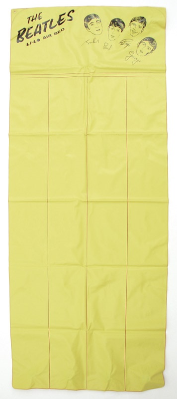 Beatles Li-Lo Air Bed is circa 1965, a great and rare Beatles merchandising piece. Displays prints of Beatles heads plus their facsimile signatures on the pillow in unused Mint, folded condition. Made of vinyl, yellow on the front and red on the back.