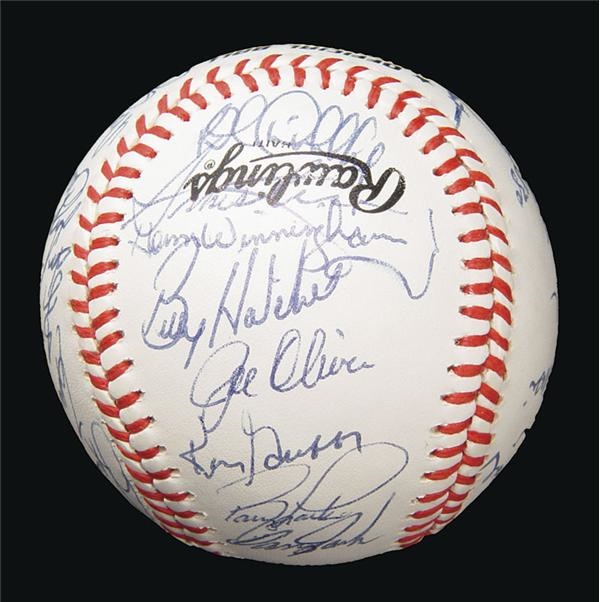 Cincy shocked the world sweeping the heavily favored A’s, ending all hopes for an Oakland dynasty. This pristine ONL (White) ball owns the signatures of all thirty-two of those World Champions including: Larkin, Sabo, O’Neill, Davis, Browning, Rijo, Morris, and Braggs. Every blue ink signature stands out boldly on the white leather surrounded by deep red stitching creating the most perfect display piece possible. Mint.