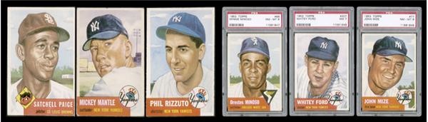 Complete at 276 cards with six numbers unissued. Now a half-century old, this classic was the last Topps set produced from hand painted portraits. Featuring the second cards of Mickey Mantle and Willie Mays, it is interesting how Topps included Mays, as Willie never played an inning in 1953, having entered the service during the previous season. Among the attractive mini artworks, the legendary Satchell Paige makes his only appearance in a Topps set. Three of the HOFers have been graded by PSA. Includes: #1 J. Robinson (GD-VG), 27 Campanella (VG-EX), 37 Mathews (VG-EX), 54 Feller (VG-EX), 61 Wynn (GD-VG), 66 Minoso (PSA 8 NM-MT), 76 Reese (VG), 77 Mize (PSA 8 NM-MT), 82 Mantle (VG), 86 B. Martin (EX), 104 Berra (EX), 114 Rizzuto (EX-MT), 147 Spahn (VG-EX), 207 Ford (PSA 7 NRMT), 220 Paige (EX), 244 Mays (GD), 258 Gilliam (EX), 263 Podres (GD), 280 Bolling (GD). Grades 15% NRMT or better, 35% EX to EX-MT, 30% VG to VG-EX, 20% GD.
