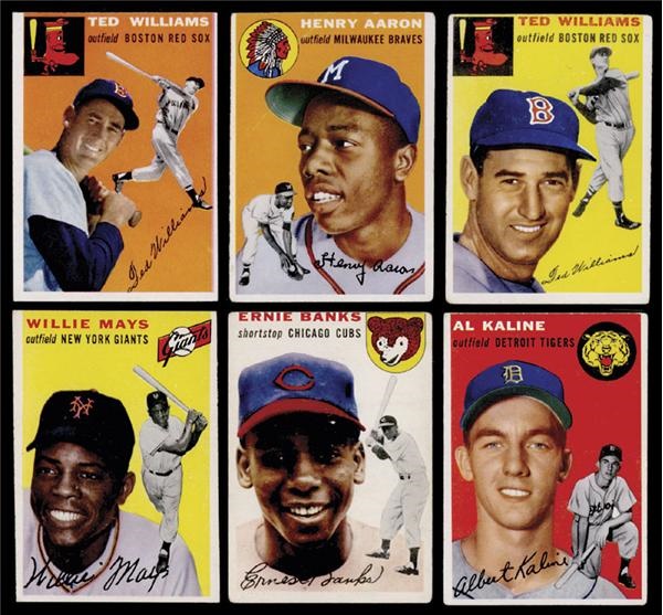 Complete at 250 cards. Topps honored arguably the greatest hitter of all-time, Ted Williams, with two cards in their 1954 set, the first and last cards. These two cards act as bookends surrounding one of the most star-studded crop of rookie cards in the hobby, with Hank Aaron, Al Kaline and Ernie Banks. While the majority of Topps issues have difficult high numbers series, the ‘54 set boasts a very challenging mid-series. Includes: #1 Ted Williams (EX-MT), 10 Robinson (GD-VG), 17 Rizzuto (EX-MT), 20 Spahn (VG-EX), 30 Mathews (EX), 32 Snider (VG-EX), 37 Ford (EX-MT), 45 Ashburn (VG), 50 Berra (EX), 90 Mays (EX-MT), 94 Banks (GD), 102 Hodges (GD), 128 Aaron (GD), 132 Lasorda (VG-EX), 201 Kaline (VG-EX), and 250 Ted Williams (VG). Grades 40% EX to EX-MT, 45% VG to VG-EX, 15% lesser.