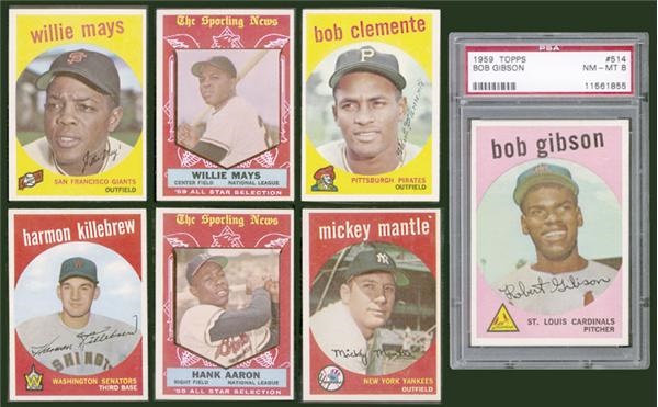 Missing only #350 Ernie Banks for completion. With all due respect to those octogenarians of the Ruth, Gehrig and Foxx days, the 1950’s were the Golden Age of baseball. Power abounded with veterans Mantle, Mays, Aaron and Snider pounding homers by the bushel with newcomers Brooks and Frank Robinson, Clemente and Killebrew just beginning their HOF careers. The pitching wasn’t bad either, with a guy named Koufax starting to get his wildness under control. The rookie crop in 1959 is short, but sweet, highlighted by a former Harlem Globetrotter named Bob Gibson (one of the first two sport stars?). It is only fitting that Gibson’s rookie is PSA graded N\M-MT 8. Includes: #10 Mantle (EX, light chip in red background), 20 Snider (NRMT), 40 Spahn (EX-MT), 50 Mays (EX-MT), 150 Musial (VG), 163 Koufax (EX-MT), 180 Berra (EX-MT), 202 Maris (NM-MT, 80/20), 212 Aaron/Mathews (EX-MT), 317 Ashburn/Mays (EX-MT), 338 Anderson (EX-MT), 360 Kaline (EX-MT), 380 Aaron (EX), 387 Drysdale (NRMT), 430 Ford (EX), 435 F. Robinson (VG-EX), 439 B. Robinson (EX), 461 Mantle HR (EX-MT), 478 Clemente (EX-MT), 509 Cash (EX-MT), 510 Yankees (VG-EX), 514 Gibson (PSA 8), 515 Killebrew (NRMT), 528 Pirates (VG-EX), 543 Corsair Trio (EX), 550 Campanella (VG), 559 Banks AS (EX), 561 Aaron AS (NRMT), 562 Kaline AS (NRMT), 563 Mays AS (NRMT), 564 Mantle AS (VG-EX), and 571 Spahn AS (EX-MT). Grades 40% NRMT or better, 50% EX to EX-MT, 10% VG to VG-EX.