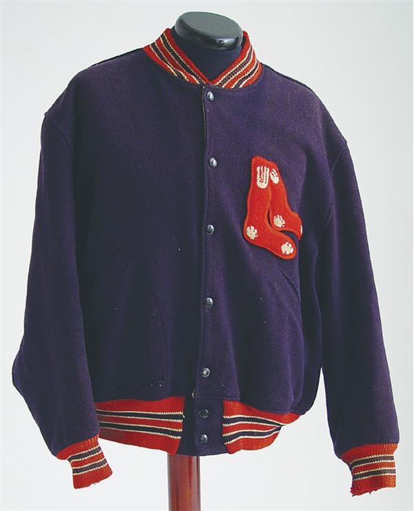Nice navy wool reversible warmer just like Teddy Baseball used to wear on those crisp autumn nights in Boston. Trimmed with a red, white and blue knit, this waist length jacket in adorned with the “Sox” team logo on the left chest and seven snap buttons down the center front. It displays tremendous use with fraying to the collar, field dirt on the inner lining, a small tear along the inner neckline and .25” hole on the right sleeve..