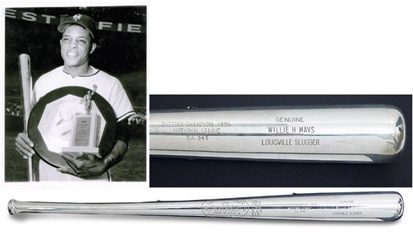 One of the most prestigious trophies in all of baseball is undoubtedly this sterling silver bat, awarded to the Batting Champion each year. Presented is the inimitable genuine article, presented to the Say Hey Kid in 1954 following a sensational MVP season in which he batted .345, capped by a World Series sweep of the Cleveland Indians. Most special is that Mays won the batting title in his debut season back from serving in the army (’52-’53). The New York Giants, who had finished in second & fifth place in the absence of Mays for those 2 seasons, won the pennant with Mays in ’54. Such is the measure of true greatness. Still, perhaps most momentous about Mays’ 1954 season “The Catch”, born out of is his sensational World Series performance. In the 8th inning of Game 1, Willie Mays raced back into deep CF in the Polo Grounds to make a spectacular over-the-head catch of Vic Wertz’s 462-foot drive with the score tied at 2 apiece. If not the greatest catch in history, it is inarguably the most famous. The Giants would go on to get the win, and the sweep! Hillerich & Bradsby 125 silver bat is stamped, “Batting Champion 1954 National League, B.A. 345” on the barrel and “Willie Mays” on the sweet spot. On the butt end of the knob is the tag, “International Sterling AZ 859 L.” You’re looking at the ultimate piece to the Say Hey legacy. EX-MT condition. Comes with a vintage wire photo of Mays holding his MVP awards, including the silver bat. Original caption still attached to verso. This is the original awarded to Mays and later obtained from a family member.