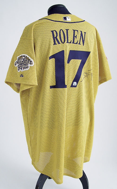 The former NL Rookie of the Year had no trouble fitting into the potent Cardinals line up during his first season in St. Louis, posting some of the best numbers of his career. His gold nylon mesh jersey, worn during batting practice, dates from the 2002 All Star game. In blue on white tackle twill, “National”, crosses the chest while, “Rolen 17”, rests on the verso along with his black sharpie signature.. On the left sleeve is a, “2002 All Star Game” patch and on the opposite is a “Phillies” logo patch. The tail is tagged “Majestic Authentic Collection” with a [size] “50” flag tag. Light but evident use. Includes MLB authenticating hologram.