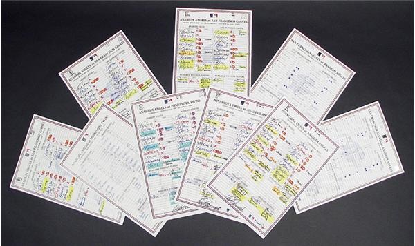 Each of the nine 11x17” cards hung in the dugouts of the league’s elite during the unforgettable end to the 2002 season. Line-ups from five of the seven Angels vs. Giants World Series Games include two written and signed by Dusty Baker and three by Mike Scioscia. The remaining four date from the ALCS series between Minnesota and Anaheim, three were completed by Scioscia and the last card was written by Ron Gardenhire. All cards are printed with the participating teams, game location and date and each owns an MLB authenticating hologram. Overall EX-MT.