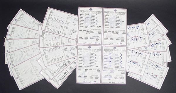 From the start of the Division Series to the heart of the World Series, this enormous collection of 11x17” line up cards details the events of the 2001 postseason. Written and signed by the skippers themselves, included are: four Yankees vs. Diamondbacks (4-Torre), two Yankees vs. Mariners (2-Pinella), eight Braves vs. Diamondbacks (4-Cox, 3-Brenley), ten from the Indians vs. Mariners (5-Pinella, 5-Manuel), five from the Cardinals vs. Diamondbacks (5-LaRussa). All cards are printed with the teams, location, game number, and series logo and all own MLB authenticating holograms. Overall EX-MT.