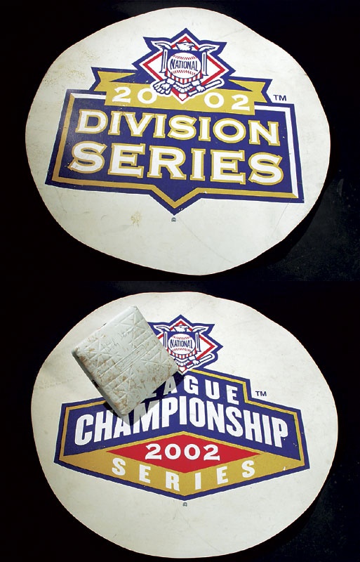 From the 2002 National League pennant race, these (2) on-deck circles (57" diameter) from the NL Division Series and NLCS reminded the New York Giants of the summer of 1951, when Bobby Thomson hit the famous “Shot Heard ‘Round the World” - the most dramatic home run in history, a 3-run HR in the 9th off of Brooklyn Dodgers Ralph Branca to clinch the pennant. One circle boasts the “NL 2002 Division Series” decal; the other, “NL 2002 League Championship Series.” Both show nice use. Includes game used base, signed on top by Bobby Thomson and special “Remember ‘51” plates displayed on 2 sides. Affixed MLB hologram stickers to all.