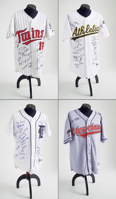 All four jerseys by Russell & Majestic are official and authenticated by Major League Baseball with hologram stickers and MLB logo embroidered on back of neckline. Includes: Cleveland Indians Ellis Burks official gamer signed on front by Burks - sports the special black band in honor of Larry Doby with his name embroidered and his number “18” below on right sleeve; Oakland Athletics (34 total signatures); Detroit Tigers (34); Minnesota Twins (31) w/ Paul Molitor. All jerseys with proper tagging. NRMT to Mint.