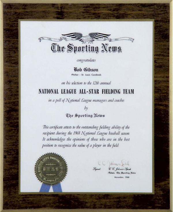 Actual plaque that is presented along with the Gold Glove Award Trophy. At the top is The Sporting News logo of the spirited eagle. It “Congratulates Bob Gibson Pitcher At. Louis Cardinals on his selection to the 12thanauual National League All-Star Fielding Team.” Signed (actual ink signature) of TSN publisher C.C. Johnson Spink. Capper is stunning gold seal and blue ribbon. 13x11”. EX-MT. From the magical season he pitched 13 shutouts on the way to a 1.12 ERA season.