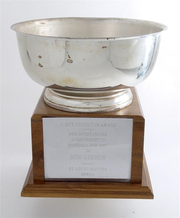 Lustrous silver plate bowl stands on matching wood base with front plaque engraved, “J. Roy Stockton Award For Outstanding Achievement In Baseball for 1967 To Bob Gibson St. Louis Chapter BBWA.” 10.5” tall. He hurled the Cardinals straight to their second World Championship in a decade with his World Series clincher versus ace Jim Lonborg and the Boston Red Sox.
