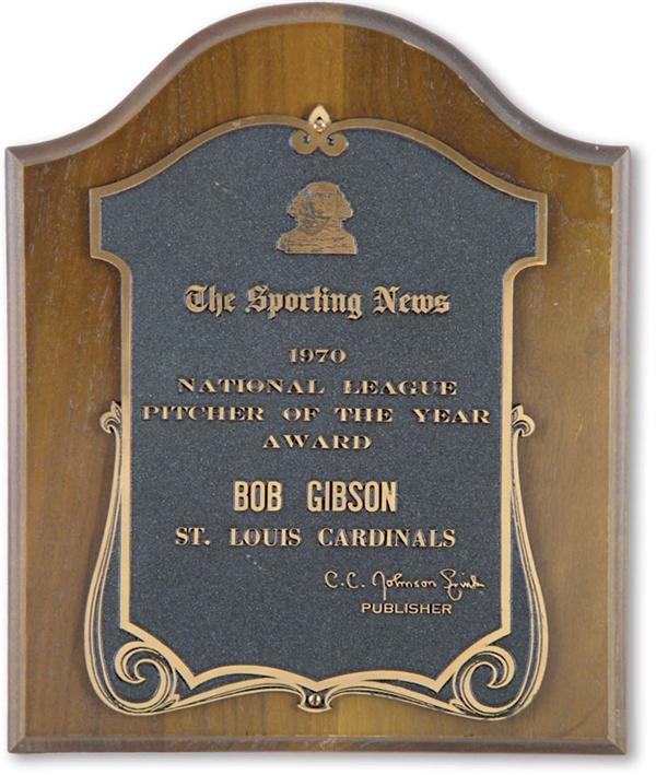Stately wooden plaque was awarded to Bob Gibson following the 1970 season, for which he was named the National League's "Pitcher of the Year." Front plate with raised bronze-tinted lettering: "The Sporting News 1970 National League Pitcher of the Year Award - Bob Gibson, St. Louis Cardinals." EX-MT.