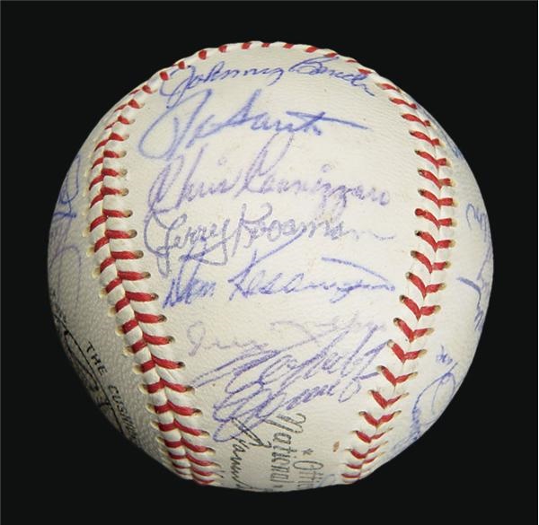 27 signatures on a Giles ONL baseball: Bob Gibson, Rose, Seaver, May, Millan, Singer, Beckert, Schoendienst, Carlton, Bristol, Mays, Dierker, Allen, Marichal, Jones, Niekro, Perez, Jackson, Aaron, Banks, Staub, Bench, Santo, Cannizarro, Koosman, and a mint Roberto Clemente. All were signed in person by the All-Stars and there are NO clubhouse signatures. NRMT. Game was played at the 1969 Professional Baseball Centennial at RFK Stadium in Washington, D.C.