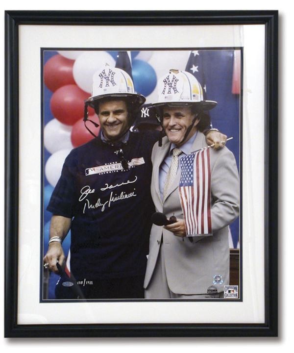 Magnificent large Steiner photo signed by Yankee’s Manager Joe Torre and then, New York City Mayor Rudy Giuliani to raise money for families of September 11th Victims. Photo is numbered #175/1911. Pictured in their Yankee fireman’s helmets, the photo captures a moment close to the hearts of New Yorkers and all Americans. NRMT condition.