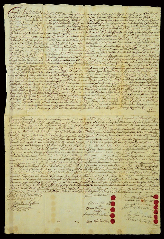 Historic 1732 document for the indenture of land (160 acres) of what was then Flattbush, Long Island and what is now Brooklyn. Cornelius Janse (Dominicus) Van der Veer received a patent for land in 1661 from Governor Peter Stuyvesant. In 1678, Cornelius purchased a 100 acres farm in Flattbush, which was located in the present day 26th & 32nd wards of Brooklyn. This original indenture is for this land in Flattbush and is between Femmetje Van der Veer of the “Township of Flatbush on Nassau Island in the Province of NewYork” and Cornelius Van der Veer of the “Township of Freehold in East New Jersey in the County of Monmouth”. He basically is giving the land to his son and heirs designated “all the nine part shares of the plantation of land, lying and being in the township off Flattbush in Kings County Aforesaid, Containing by estimate one hundred and sixty acres of Land …Bounded West by the street or Kings high way…” Indenture measures 17x24” and has the signatures and wax seals of twelve different members of the Van der Veer family. Condition of the document is EX-MT.