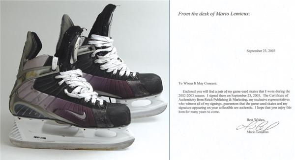 Arguably one of the best players ever to play the game, Mario Lemieux wore these Nike V 12 skates during 2002-03 season. The skates are fantastic to look at, the boot is made of iridescent plastic. They show very good game use and are great for display. Both are signed by Lemieux and are accompanied by a letter of authenticity by Reich Publishing and Marketing (RPM) as well as one from Lemieux.