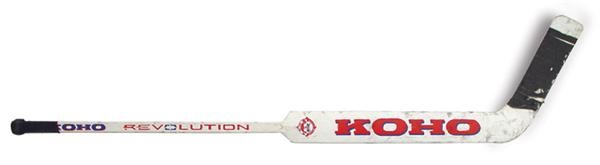 A rare early model white Koho Revolution used by the NHL’s all time winningest goalie, Patrick Roy. Shows world class use and wear with no cracks and completely intact. Black tape on the blade is slightly tattered and worn from age and use. Top of handle is completely wrapped in black tape as well. Stamped, “08 06 97” on the back of handle.
