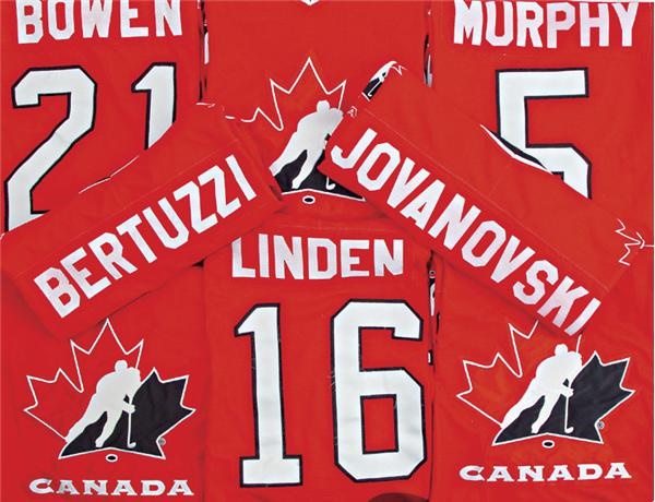Collection of (15) red Bauer Air Knit jerseys came out of the men’s World Championships in Zurich, Switzerland (May, 1998). Many NHL stars include Todd Bertuzzi, Rucchin, Primeau, Emerson, Patrick, Whitney, Larry Murphy, Cross, Daze, Bowen, Zamuner, Gelinas, Hacket, Linden, and Jovanovski. Light to moderate use.