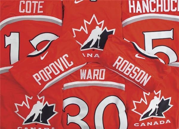 The 2000 Under 18 National Team was picked by scouts from the Canadian Hockey Association and coached by Ken Babey.  These players represented Canada in Slovakia from Aug 17-20, 2000 and battled for the gold against the USA, Slovakia and the Czech Republic.  Nike made these beautiful Red Air Knit/Dazzle cloth jerseys.  The young budding players who wore them include Hare, Cammalleri, Stoll, Leclaire, Vermette, Olynick, McLeod, Harrison, St. Piere, Herrington, Aulin, Newbury, Knopp, Ward, Hanchuck, Bell, Cote, Popovic, & Robson.  Light to moderate use.