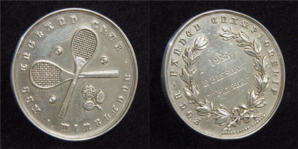 Perhaps the earliest known tennis prize in history, this was presented to William Renshaw following the 5th Wimbledon Championship in 1888. The first Wimbledons were completely dominated by William Renshaw, who won the tournament 8 times between 1881-1889 (a still standing record in tennis). Renshaw was the original inventor of the overhead smash. With his twin brother, Ernest Renshaw, he won the doubles title an equally impressive 7 times in the same period. This is that medal awarded to the brothers, following their 1888 triumph. Miraculously, this antiquated coin-shaped medal has withstood 116 years of oxidation, its raised imaging and letters still prominent with every detail visible to the naked eye. Front is two crossed tennis racquets with “All England Club Wimbledon” surrounding in raised letters. Obverse is engraved, “1888 E. Renshaw, W. Renshaw” in the center, encircled by ivy leaves and “Four-Handed Championship” in raised lettering. Carries the cartouche, "Harry Soane, London". This piece has been brilliantly restored and is glistening on all sides with no tarnishing in sight. EX-MT. Comes with two small photos showing members of the Renshaw family and the Renshaw estate, back in the 1920’s, plus a cabinet photo of Ernest Renshaw.
