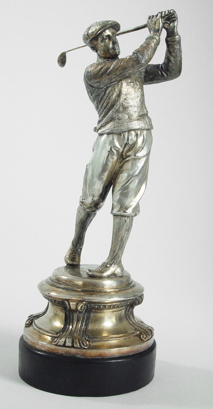 Stately golf trophy is a 19” tall sculpture in white metal of the greatest golf champion in history, Bobby Jones. Stands on black podium with some tarnishing. All-original, VG-EX condition.