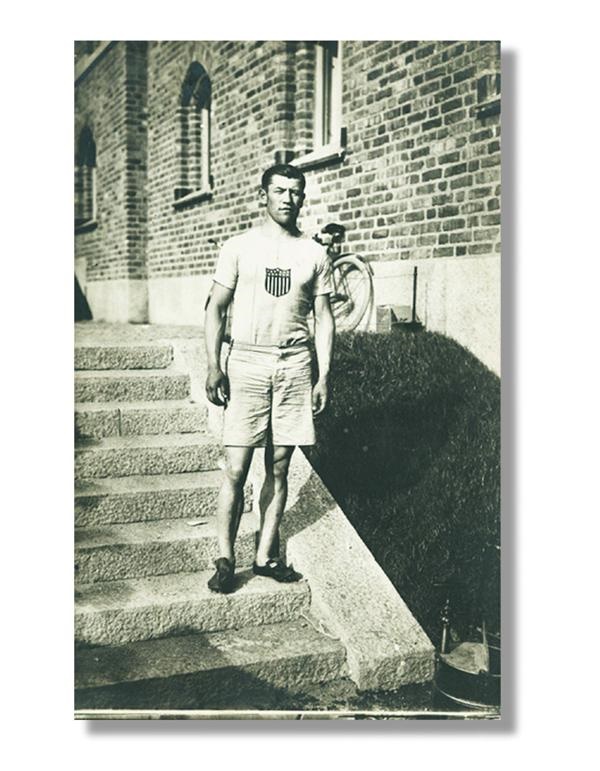 NRMT photo on a postcard from the 1912 Olympics at Stockholm displays a great photo of Jim Thorpe wearing the U.S. Olympic T-shirt. Perfect contrast and postcard is nearly flawless.