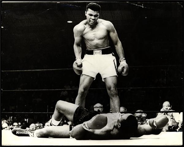 This is the wire photograph version of the famed image of a victorious Cassius Clay standing over Sonny Liston after his one round KO in their 1965 fight in Lewiston, Maine. This original British wire photo is the first specimen we have seen. Stamped on the reverse by United Press International, it is far superior to the American version as it is a heavier stock and on higher quality, more luxurious paper. Original caption on back reads, "Champion Cassius Clay stands over a fallen Sonny Liston and taunts him to get up and fight in the first (and last round of their fight here last night..." Minor creases o/w EX.