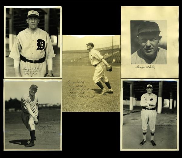 Superb set of vintage photographs, all boasting incredible signatures from baseball’s innovator of the slider, George Uhle. Most are dated, and all notations are in the hand of Uhle. Signatures in black fountain ink grade mostly 9-10 out of a possible 10! Added notations are as follows: “NY Yankees 1933 & 1934,” Best Wishes Cleveland Indians, 1919-1928, 1936-1937 Coach,” “Detroit Tigers, 1929-1933” [on 5 photos], “New York Giants 1933,” “Cleveland Indians Coach, 1936 & 1937” [on 3], “Best Wishes” on one. Only one photo is signed with just his name. Sizes range from 6x8” to 8x10”. VG-EX to EX - all signatures display beautifully with no flaws or damage.