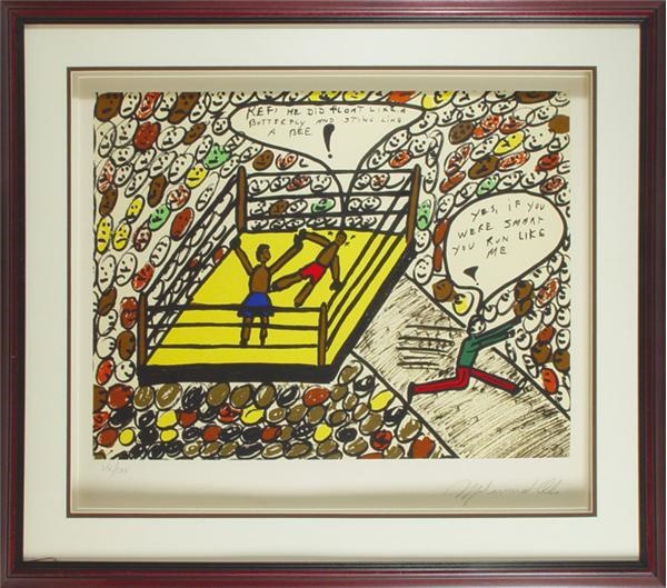 Muhammad Ali is a man of many talents, one of which is drawing. Offered is one of his most enjoyable lithographs, featuring him in the ring. Signed boldly in pencil, and numbered 246/500. Framed, 32 1/2 x 29 inches.